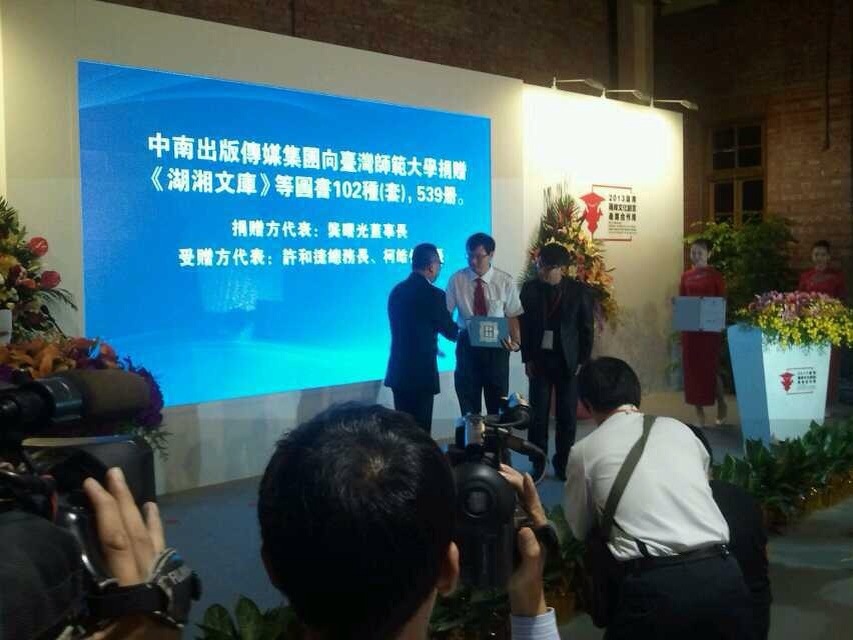 9月18日,“2013湖南兩岸文化創意產業合作周”在臺北華山文創園區開幕。在開幕式上,中南傳媒董事長龔曙光作為捐贈代表向臺灣師范大學捐贈了包括《湖湘文庫》在內的102種湘版圖書,共計539冊,此次捐贈有利于加深臺灣大學生及民眾對湖湘文化的了解和學習。
