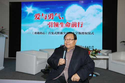 1月8日,由中南傳媒與湖南少年兒童出版社主辦的“愛(ài)與勇氣,引領(lǐng)生命前行——《勇敢的心》首發(fā)式暨湘少童書(shū)大字版授權(quán)儀式”在中國(guó)國(guó)際展覽中心隆重舉行。中國(guó)殘聯(lián)副主席呂世明、中國(guó)盲文出版社社長(zhǎng)張偉、中國(guó)殘聯(lián)新聞部主任郭利群、文秘處處長(zhǎng)楊虹、湖南省版協(xié)主席張?zhí)烀鳌⒅心蟼髅礁笨偨?jīng)理劉清華、兒童文學(xué)作家湯素蘭、趙冰波、王一梅、宗介華、《勇敢的心》作者李爽及書(shū)中小主人公代表來(lái)佳俊和趙晨、我社副社長(zhǎng)吳雙英等出席首發(fā)式,并分別從不同的角度對(duì)這本書(shū)的價(jià)值和意義進(jìn)行了探討和交流。新書(shū)首發(fā)式由我社副社長(zhǎng)吳雙英主持。