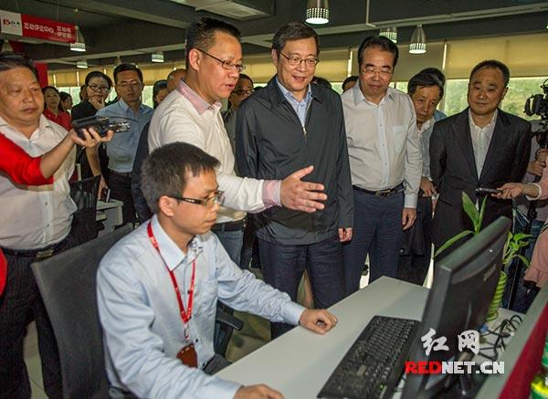 (湖南省委副書記、省長杜家毫[右四]在仔細了解紅網的精品創意欄目的生產情況。)