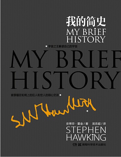 2014年7月25日,在湖南科學(xué)技術(shù)出版社“首席編輯薦書”活動(dòng)中,史蒂芬·霍金新作《我的簡史》上市發(fā)布。與之前的《霍金傳》、《飛向無限》這兩本由別人撰寫的傳記不同,這是第一本由霍金親自著述的自傳。該書定價(jià)42元,由中南出版?zhèn)髅郊瘓F(tuán)旗下湖南科學(xué)技術(shù)出版社出版發(fā)行,首印達(dá)到了50000冊,將通過全國的新華書店、網(wǎng)上書店等渠道公開發(fā)行。其特別設(shè)計(jì)的霍金親筆簽名的鏤空封面和精裝效果,使本書兼具很好的閱讀價(jià)值和收藏價(jià)值。