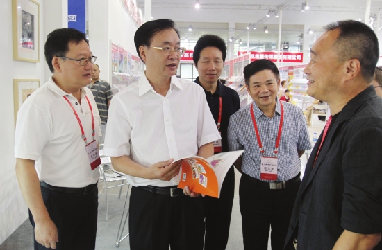 8月1日,貴州省貴陽市,湖南省副省長李友志(左二)在湖南省新聞出版廣電局黨組書記、局長朱建綱(左一),湖南代表團團長朱三平(右二),湖南出版投資控股集團黨委書記、董事長,中南傳媒董事長龔曙光(右一),中南傳媒副總經理劉清華(左三)的陪同下巡視第24屆書博會湖南展館。