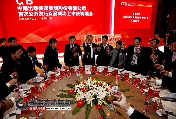 在昨天的酒會上,中宣部副部長孫志軍,國家新聞出版總署副署長鄔書林,湖南省委常委、宣傳部部長路建平,中銀國際董事長唐新宇和中南傳媒董事長龔曙光等一起用熱情的紅酒澆鑄冰雕,宣告中南傳媒正式走向資本市場。
