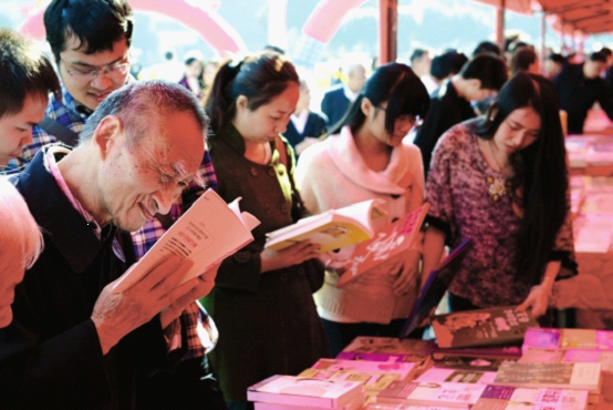 中南傳媒旗下各出版社在賀龍體育中心東廣場搭建的圖書展示臺吸引了許多讀者。啟動儀式剛結束,許又聲一行來到展臺前,與書迷們一起分享讀書的快樂。